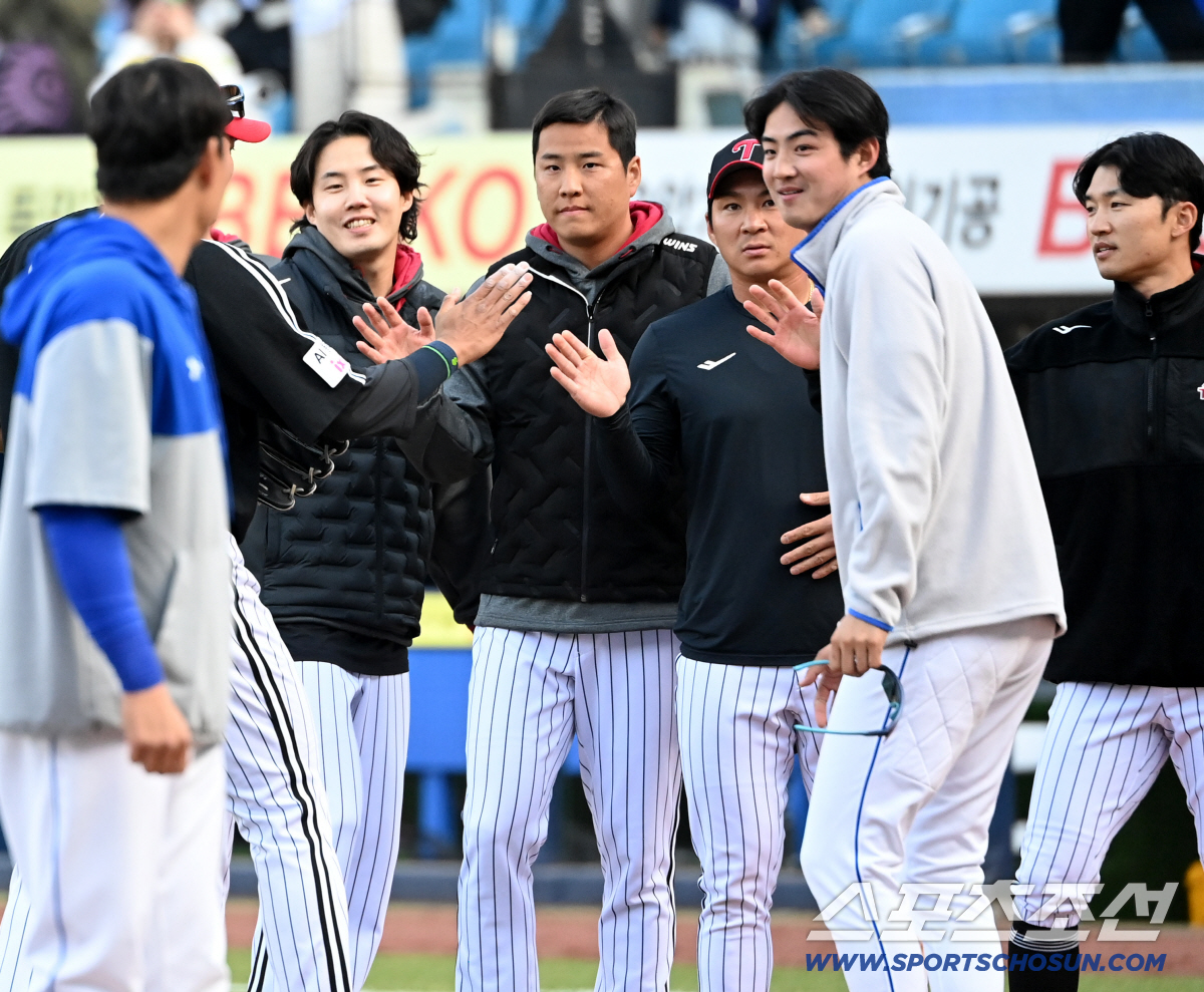 22일 대구삼성라이온즈파크에서 열린 LG와 삼성의 시범경기. LG가 14대13으로 승리했다. 경기 종료 후 구자욱이 임찬규 박해민 등 LG 선수들과 이야기를 나누고 있다. 대구=허상욱 기자wook@sportschosun.com/2026.03.22/