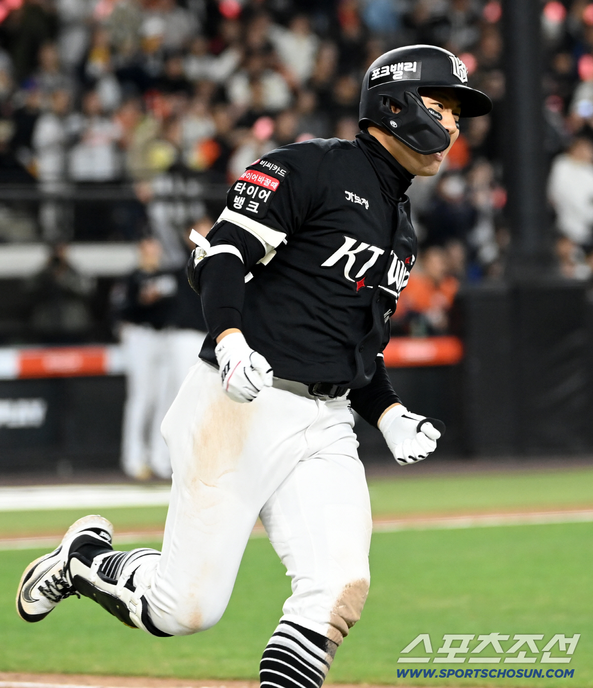 1일 대전한화생명볼파크에서 열린 KT와 한화의 경기. 8회초 2사 만루 KT 최원준이 3타점 2루타를 치고 환호하고 있다. 대전=허상욱 기자wook@sportschosun.com/2026.04.01/