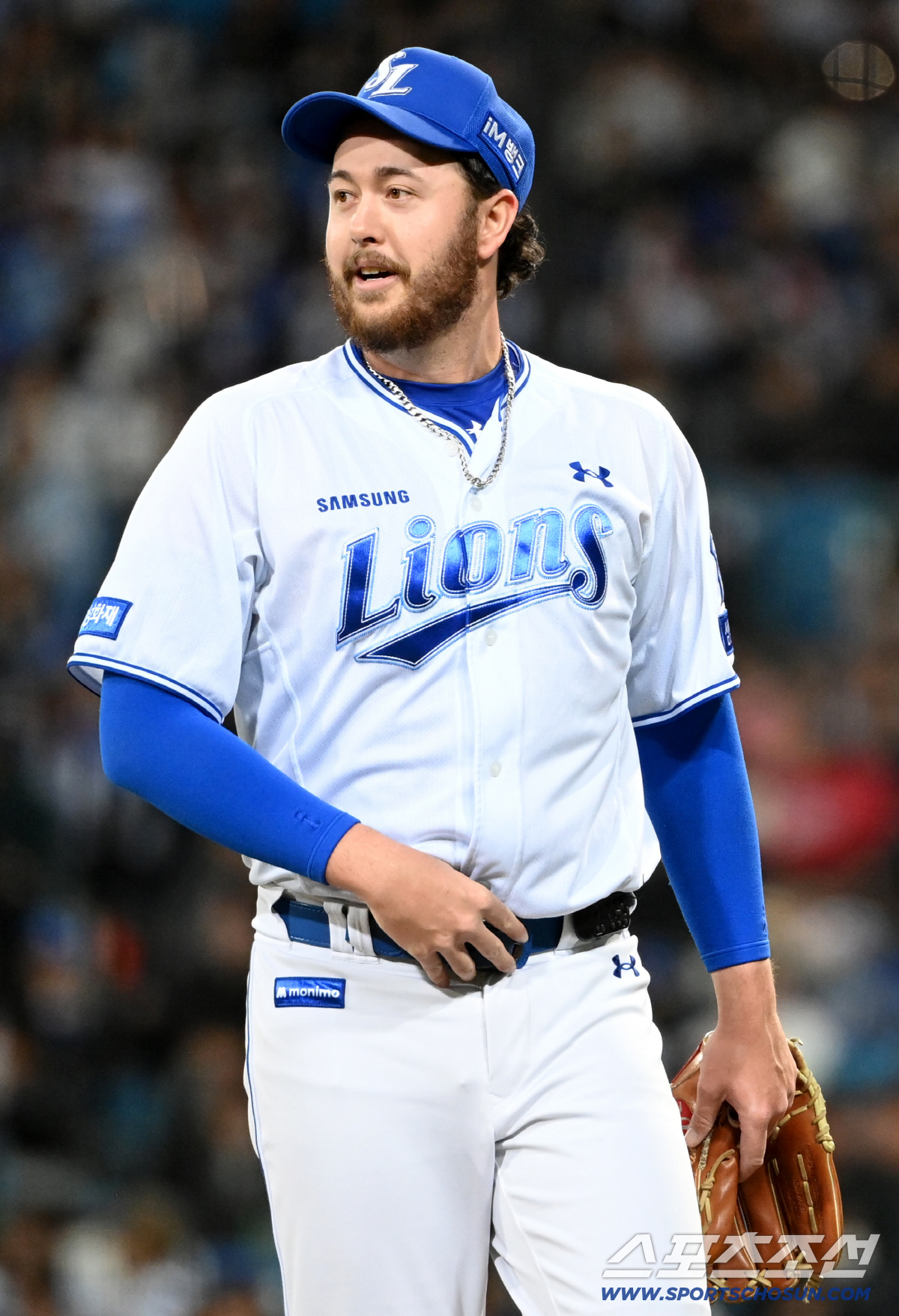 23일 대구삼성라이온즈파크에서 열린 SSG와 삼성의 경기. 4회초 2사 3루 오러클린이 김재환을 헛스윙 삼진처리 후 이닝을 끝낸 뒤 3루주자 에레디아와 이야기를 주고받고 있다. 대구=허상욱 기자wook@sportschosun.com/2026.04.23/