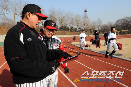 LG가 10일 잠실구장에서 체력테스트로 새해 첫 훈련을 시작했다. 김기태 감독이 김용일 트레이너 코치와 함께 선수들의 4Km 장거리 달리기를 지켜보며 기록을 살피고 있다. 잠실=허상욱 기자 wook@sportschosun.com/2012.01.10/ |