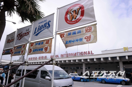 | 일본 오키나와에 위치한 나하 국제공항 정문에 지난해 2월 한국 프로야구팀을 환영하는 대형 플래카드가 걸려 있다. 오키나와(일본)=조병관 기자rainmaker@sportschosun.com |