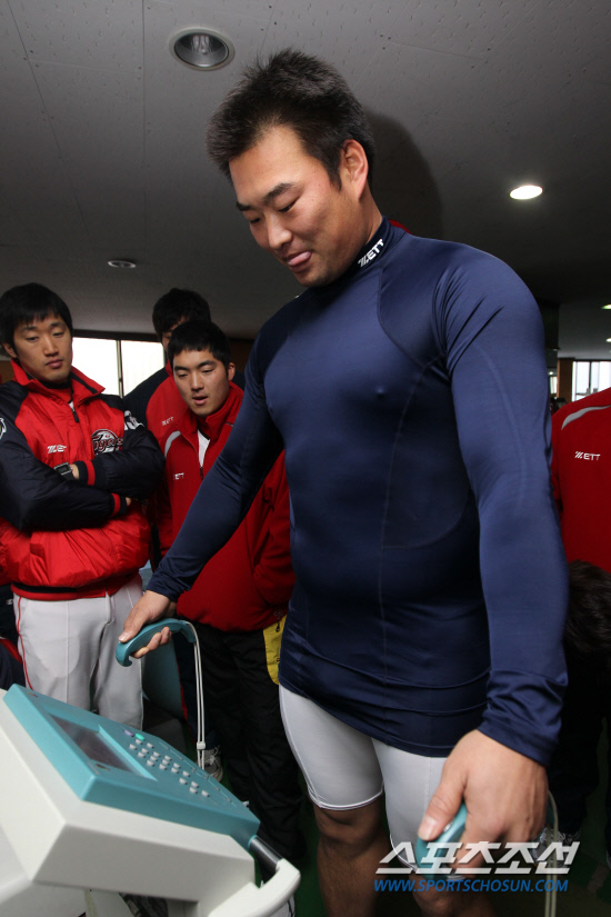KIA 김진우가 지난 8일 광주구장에서 열린 새해 첫 훈련 때 체지방을 체크하고 있다. 김진우는 휴식기간 체지방을 10%나 줄였고, 근육을 키워 선동열 감독의 칭찬을 받았다. 광주=전준엽 기자 noodle@sportschosun.com