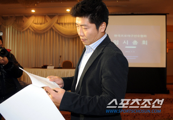 프로야구선수협회 내부갈등이 심화되고 있는 가운데 3일 오후 역삼동 한 호텔에서 선수협 임시총회가 열렸다. 박재홍 회장이 임시총회에서 다뤄질 문건를 심각한 표정으로 읽고 있다. 전준엽 기자 noodle@sportschosun.com/2012.01.03/ |