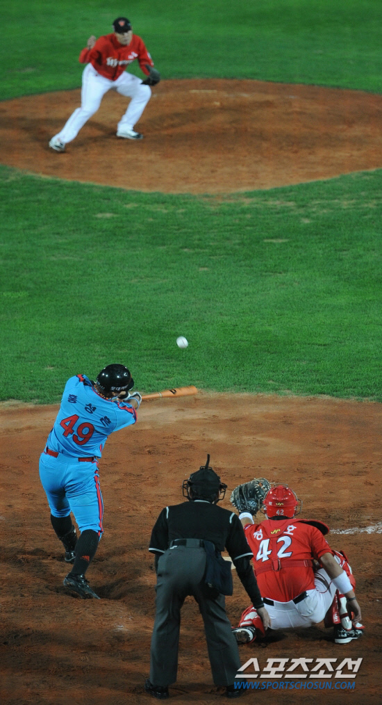 ◇롯데 홍성흔이 지난해 9월 21일 부산 사직구장에서 열린 SK전에서 당시 SK 소속이던 정대현을 상대로 안타를 뽑아내고 있다. 두 사람은 2012 시즌 롯데에서 동료로 뛰게 됐다. 전준엽 기자 noodle@sportschosun.com |