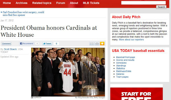 세인트루이스의 빌 드윗 구단주는 오바마 대통령에게 배번 '44'가 적힌 유니폼과 야구 배트를 선물했다.
