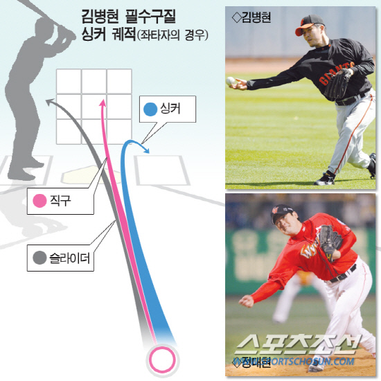 바로 이 싱커가 김병현에게도 필요한 무기다. 메이저리그에서 뛸 때부터 김병현은 늘 체인지업과 싱커에 대한 필요성을 느꼈다. 왼손타자의 바깥쪽으로 휘며 떨어지는 구질에 대한 필요성은, 잠수함투수에겐 절실하다. 김병현은 미국에서 오른손타자 상대 피안타율 2할2푼1리, 왼손타자 상대 피안타율 2할7푼4리를 기록했다.