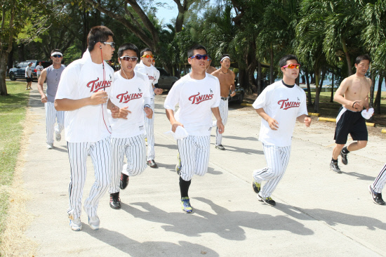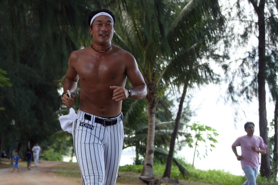 가뜩이나 많이 뛰는데 숙소까지 뛰는 날엔 거의 죽을 맛이다. 더욱 따갑게 살이 오른다. 훈련장인 수수페구장에서 숙소인 피에스타 리조트까지 거리는 6.5㎞정도. 원래는 훈련사이클당 1회씩 숙소까지 러닝이 예정돼 있었다. 진주 마무리캠프에 참가한 이들은 이런 '숙소까지 뛰어'식 훈련에 익숙해져 있다보니 무리없이 러닝을 소화했다.