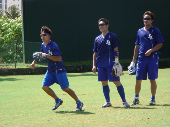 | 괌의 뜨거운 햇살아래 삼성 김상수, 조동찬, 채태인(왼쪽부터) 등 내야수들이 펑고 수비를 하고 있다. 사진제공=삼성 라이온즈 |