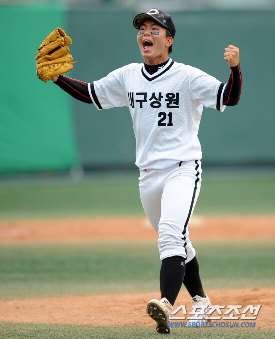 | 지난해 제66회 청룡기 전국고교야구선수권대회 결승에서 천안북일고와의 결승전에서 타자를 잡고 환호하고 있는 대구상원고 2학년 김성민. 김성민은 3승 방어율 0으로 대회 MVP를 차지했다. 스포츠조선DB |