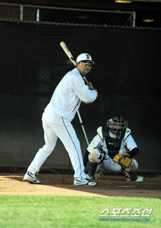 | 두산 김진욱 감독이 1일(한국시각) 왼손 사이드암스로 김창훈의 불펜피칭때 왼쪽 타석에 들어서서 공을 기다리고 있다. 사진제공=두산 베어스 |
