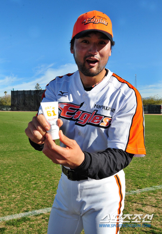 28일 오전(한국시각) 미국 애리조나주 투산 '키노 스포츠 콤플렉스'에서 열린 한화 이글스 스프링캠프에서 박찬호가 자신의 등번호가 찍힌 자외선 차단제를 바르고 있다. 투산(애리조나주)=김경민 기자 kyungmin@sportschosun.com / 2012.01.28.