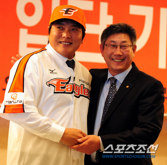 김태균이 독수리 날개를 달았다. 한화와 연봉 15억원에 입단계약을 마친 김태균은 12일 대전 리베라 호텔에서 공식 입단식을 갖고 한화맨이 됐다. 김태균이 모든 일정을 마친 후 한대화 감독과 손을 맞잡고 기념촬영을 하고 있다. 대전=김재현 기자 basser@sportschosun.com 2011,12,12 |