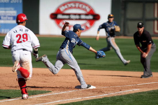 이날 NC 타선은 2루수 박민우-유격수 노진혁-중견수 나성범-좌익수 이명환-우익수 김종찬-지명타자 조평호-1루수 김정수-3루수 김동건-포수 허 준으로 짜여졌다. 2012 신인드래프트서 1라운드에 지명한 '이영민 타격상' 수상자 박민우가 가장 눈에 띄었다. 지난 7일 자체 청백전에서 3타수 3안타로 감을 끌어올린 그는 이날 3타수 2안타 1볼넷 1도루 2득점을 기록했다.