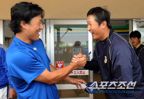 삼성과 오릭스의 연습경기가 21일 오키나와 온나손 아카마구장에서 열렸다. 경기전 오카다 감독과 이승엽이 인사를 나누고 있다. 오키나와(일본)=전준엽 기자 noodle@sportschosun.com/2012.02.21 |