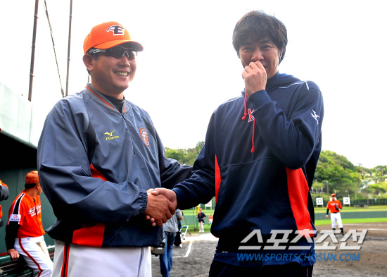 | 한화와 야쿠르트의 연습경기가 22일 오키나와 우라소에구장에서 열렸다. 경기전 임창용이 한화 한대화 감독을 만나 인사를 나누고 있다. 오키나와(일본)=전준엽 기자 noodle@sportschosun.com |