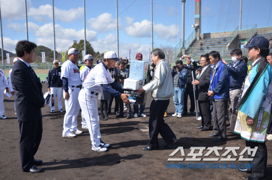 | 아이라시 사사야마 시장이 두산 김진욱 감독에게 선물을 전달하고 있다. 사진제공=두산 베어스 |