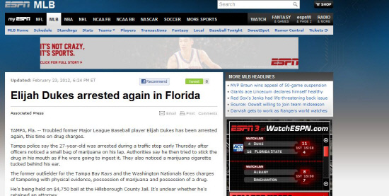 미국 스포츠전문 매체 ESPN은 24일(한국시각) '전직 메이저리그 선수이자 트러블메이커로 유명한 듀크스가 플로리다주 탬파에서 약물 복용 및 소지 혐의로 경찰에 체포됐다'고 보도했다.