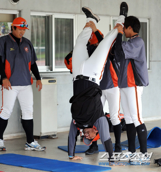 "left' bgcolor="#ffffff' class="caption'>한화 선수들이 26일 오키나와 카데나 구장에서 훈련을 가졌다. 류현진이 박찬호의 물구나무서기를 지켜보고 있다. 한편 삼성과의 연습경기가 우천 취소되어 훈련장 한켠에서 가벼운 몸풀기로 훈련이 대체됐다. 오키나와(일본)=전준엽 기자 noodle@sportschosun.com |