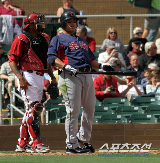 클리블랜드 인디언스의 추신수(오른쪽)가 8일(한국시각) 미국 애리조나주 스코츠데일의 솔트 리버 필드에서 벌어진 애리조나 다이아몬드백스와의 시범경기 3회초 파울을 친 뒤 안타까운 표정으로 공쪽을 바라보고 있다. 스코츠데일(미 애리조나주)=이사부 기자 golf@sportschosun.com