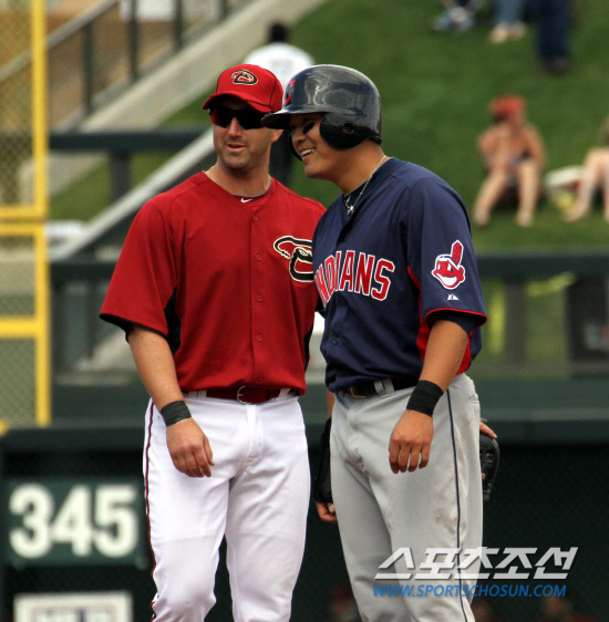 클리블랜드 인디언스의 추신수(오른쪽)가 8일(한국시각) 미국 애리조나주 스코츠데일의 솔트 리버 필드에서 벌어진 애리조나 다이아몬드백스와의 시범경기 3회초 연속 볼넷으로 2루에 진루한 뒤 유격수 윌리 블룸퀴스트와 대화를 나누며 웃고 있다. 이 둘은 시애틀에서 함께 마이너 생활을 해 친한 사이다. 스코츠데일(미 애리조나주)=이사부 기자 golf@sportschosun.com