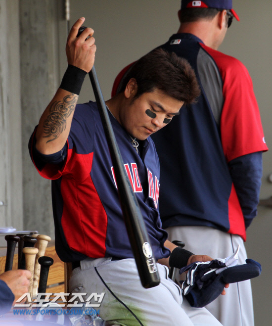 클리블랜드 인디언스의 추신수가 8일(한국시각) 미국 애리조나주 스코츠데일의 솔트 리버 필드에서 벌어진 애리조나 다이아몬드백스와의 시범경기 도중 덕아웃에서 자신의 배트를 꺼내며 타석에 들어설 준비를 하고 있다. 스코츠데일(미 애리조나주)=이사부 기자 golf@sportschosun.com