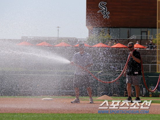 10일(한국시각) 이대은(23)이 출전한 메이저리그 시카고 컵스와 시카고 화이트삭스의 시범경기가 벌어지기 전 미국 애리조나주 글렌데일의 카멜백 랜치에서 운동장 관리인들이 물을 뿌리며 게임을 준비하고 있다. 이 야구장은 시카고 화이트삭스와 LA 다저스가 스프링캠프로 사용하고 있다. 글렌데일(미 애리조나주)=이사부 기자 golf@sportschosun.com