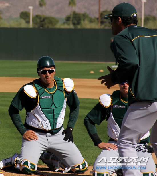 메이저리그 오클랜드 어슬레틱스와 계약한 포수 김성민(왼쪽)이 10일(한국시각) 미국 애리조나주 피닉스의 파파고 파크에서 열리고 있는 오클랜드 스프링캠프에서 포수 코치로부터 수비에 대한 현장 강의를 듣고 있다. 김성민은 일주일 전 난생 처음으로 메이저리그 스프링캠프에 참가했다. 피닉스(미국 애리조나주)=이사부 기자 golf@sportschosun.com