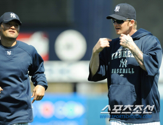 지난 2010년 3월 플로리다 탬파의 양키스 스프링캠프에서 박찬호와 함께 이야기를 나누고 있는 A.J. 버넷(오른쪽). 조병관기자 rainmaker@sportschosun.com