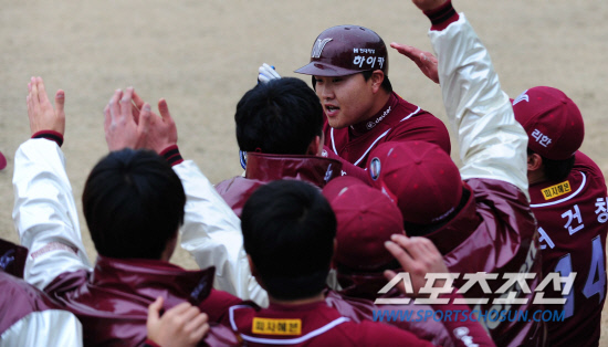 16일 오후 청주 종합경기장 야구장에서 한화와 넥센의 연습경기가 열렸다. 9회초 무사 1,2루서 넥센 오재일이 우중월 3점 홈런을 친 후 덕아웃에서 동료들과 환호하고 있다. 청주=김경민 기자 kyungmin@sportschosun.com
