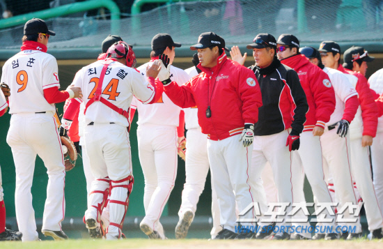 20일 인천 문학구장에서 2012 프로야구 시범경기 SK와 삼성의 경기가 열렸다. 9대1의 승리를 거둔 SK 이만수 감독이 선수들과 하이파이브를 하고 있다. 인천=정재근 기자 cjg@sportschosun.com