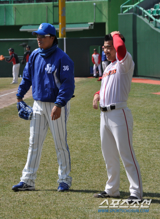 삼성 이승엽(왼쪽)과 SK 정근우가 지난 20일 시범경기에 앞선 훈련시간에 만나서 얘기를 나누고 있다. 인천=권인하 기자 indyk@sportschosun.com