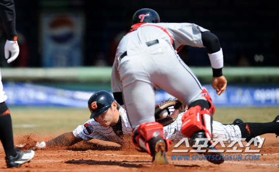 롯데와 LG의 2012 프로야구 시범경기가 24일 부산 사직구장에서 열렸다. 1회말 1사 1,3루 롯데 홍성흔의 포수 앞 땅볼때 3루 이승화가 홈으로 파고들어 세이프되고 있다. LG 포수는 유강남. 부산=허상욱 기자 wook@sportschosun.com/2012.03.24/ |