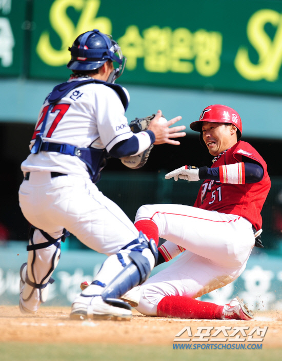 하지만 야구선수로 환갑을 넘긴 임재철은 둘 다 문제가 없다. 오히려 한창 때인 후배들보다 낫다. 판단이 빠르고 수비 폭이 넓은데다 어깨까지 강하다. 특히 어깨는 여전히 국내 외야수 중 정상급 강견을 자랑한다. 그는 지난 25일 잠실구장에서 열린 KIA와의 시범경기. 1-0으로 앞선 7회초 1사 1,3루에서 김상훈의 외야 플라이를 잡은 우익수 임재철은 주저 없이 홈으로 송구해 원바운드로 정확하게 포수 미트에 꽃았다. 정상 수비 위치에서 잡을 정도로 얕은 타구가 아니었다. 하지만 후속 동작이 워낙 간결하고 송구가 정확해 발빠른 3루 주자 김원섭은 홈에서 접전조차 펼치지 못한채 태그 아웃. 흐름 상 이날 승부를 가른 명품 수비였다.