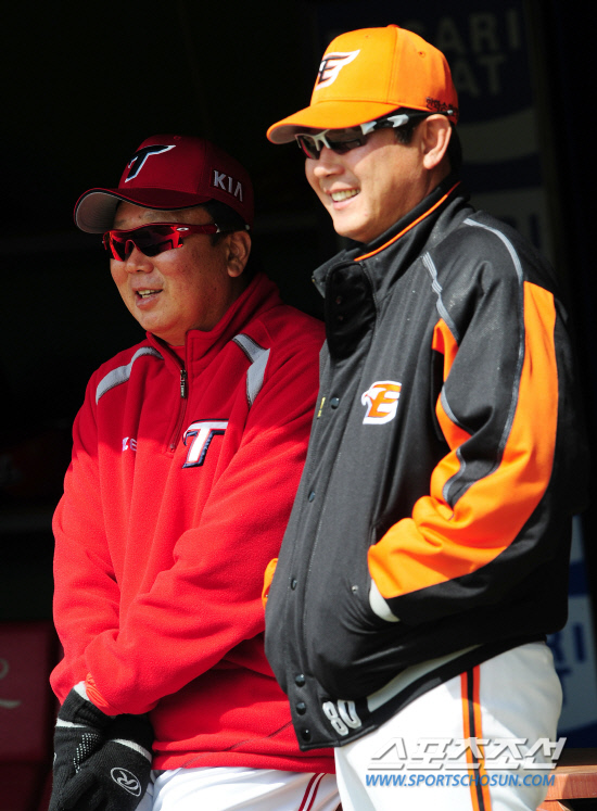 1일 광주구장에서 열린 2012 프로야구 시범경기 한화와 기아의 경기를 앞두고 기아 선동열 감독과 한화 한대화 감독이 이야기를 나누고 있다. 광주=정재근 기자 cjg@sportschosun.com/2012.04.01/