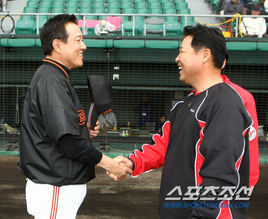 | 요미우리 하라 다쓰노리 감독(왼쪽)과 일본에서 열린 연습경기에 앞서 인사를 하고 있는 SK 이만수 감독. 사진제공=SK 와이번스 |