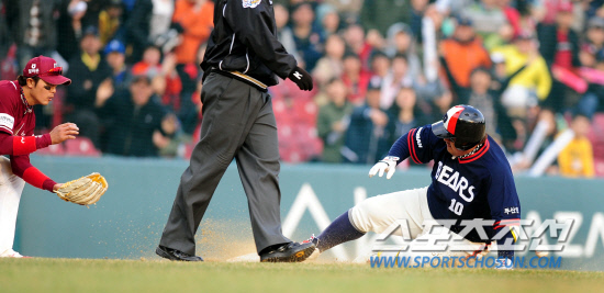 두산 13-11 넥센=안타 40개를 주고받는 난타전. 역시 두산의 뒷심은 강했다. 두산은 8-11로 뒤진 8회말 안타 7개를 집중시키며 5점을 뽑아 전세를 뒤집었다. 10-11로 한 점차로 추격한 뒤 1사 2,3루에서는 최준석이 넥센 마무리 손승락을 2타점 우중간 3루타로 두들겨 역전 드라마를 완성했다. 두산 마무리 프록터는 9회 등판해 1이니을 1안타 무실점으로 막고 국내 첫 세이브를 올렸다. 두산 김진욱 감독은 사령탑 데뷔 첫 승의 감격을 맛봤다.