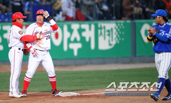 새 배트와의 궁합이 잘 맞아 떨어졌을까. 나지완은 첫 타석부터 괴력을 발휘하면서 선 감독을 흡족케했다. 이날 2회 선두타자로 나온 나지완은 삼성 선발 윤성환의 3구째를 밀어쳐 우전 3루타를 친 것이다. 단타성이었는데, 삼성 우익수 우동균이 다이빙캐치를 시도하다 공을 놓치면서 타구가 펜스까지 굴러갔다. 그 사이 나지완은 열심히 3루로 뛰어 살았다. 발이 느린 편인 나지완에게 3루타는 홈런보다 훨씬 달성하기 어려운 기록. 데뷔 후 2008년 10월4일 광주 두산전에서 딱 한 차례 기록했을 뿐이다. 통산 2호 3루타를 친 나지완은 덕아웃을 바라보며 웃었다. SUN을 향한 고마움이 담긴 미소였다. 광주=이원만 기자 wman@sportschosun.com