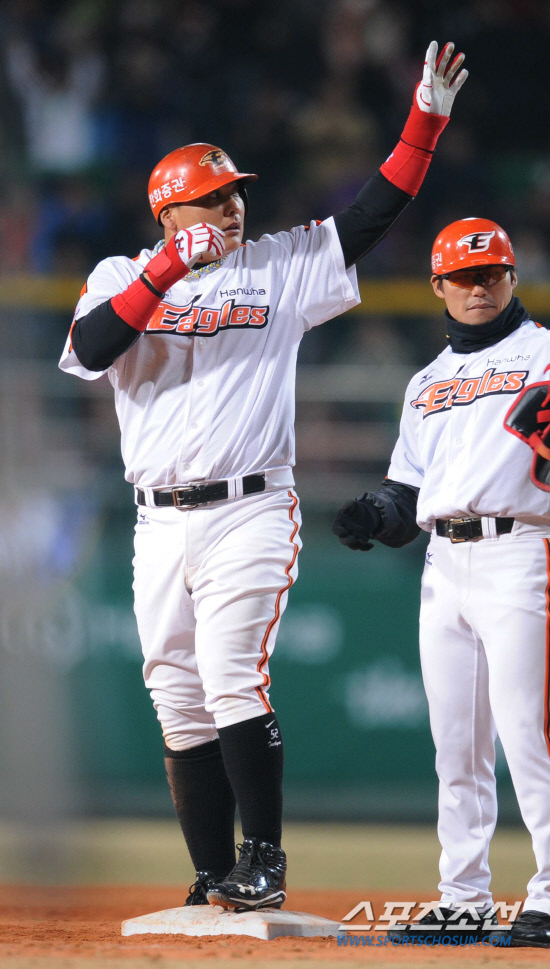 12일 오후 청주구장에서 2012 프로야구 두산과 한화의 경기가 열렸다. 5회초 1타점 적시타를 친 한화 김태균이 팬들을 향해 손을 들어 보이고 있다. 청주=김경민 기자 kyungmin@sportschosun.com