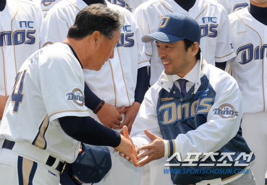 14일 경남 창원 마산야구장에서 NC다이노스 창단 및 홈 개막 경기가 열렸다. 개막 공식 행사에서 김경문 감독이 김택진 구단주(오른쪽)와 악수를 나누고 있다. 창원=송정헌 기자 songs@sportschosun.com/2012.4.14