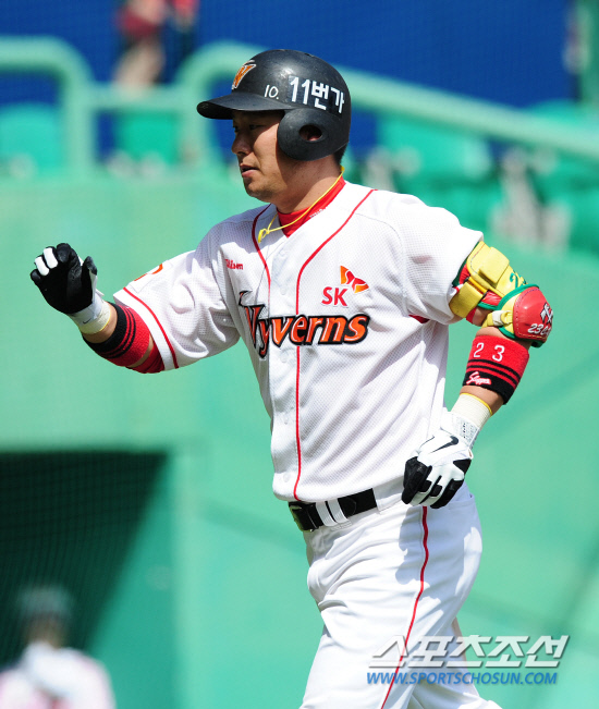 15일 인천구장에서 2012 프로야구 한화와 SK의 경기가 열렸다. 2회말 1사 SK 안치용이 좌중월 솔로 홈런을 터뜨린 뒤 홈을 밟고 있다. 인천=정재근 기자 cjg@sportschosun.com/2012.04.15/ |