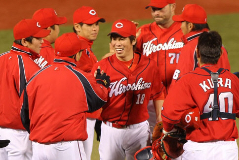 6일 요코하마전에서 노히트노런을 기록한 히로시마 투수 마에다가 경기후 동료들로부터 축하인사를 받고 있다. 사진캡처=스포츠닛폰 홈페이지