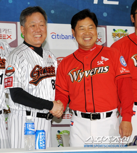 | 롯데 양승호 감독과 SK 이만수 감독대행이 지난해 플레이오프 미디어데이에서 악수를 나누는 장면. 스포츠조선DB |