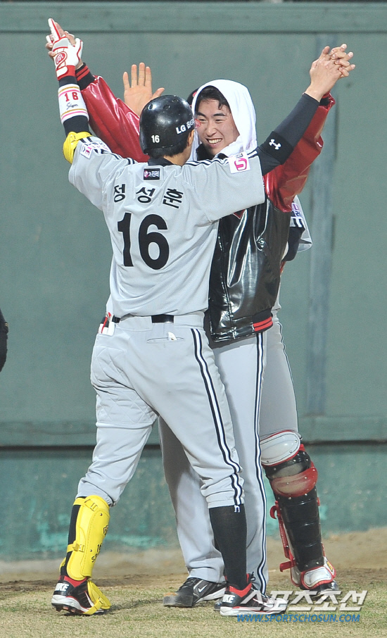 프로야구 한화와 LG의 경기가 19일 청주야구장에서 펼쳐졌다. 정성훈이 9회초 선두타자로 나서 류현진에게 선제 솔로포를 터뜨리고 우규민과 하이파이브를 나누고 있다. 청주=전준엽 기자 noodle@sportschosun.com