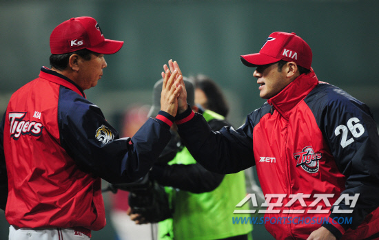 19일 목동구장에서 2012 프로야구 KIA와 넥센의 경기가 열렸다. 기아가 4대1로 승리를 거둔 가운데 승리투수 서재응이 선동열 감독과 하이파이브를 하고 있다. 목동=정재근 기자 cjg@sportschosun.com