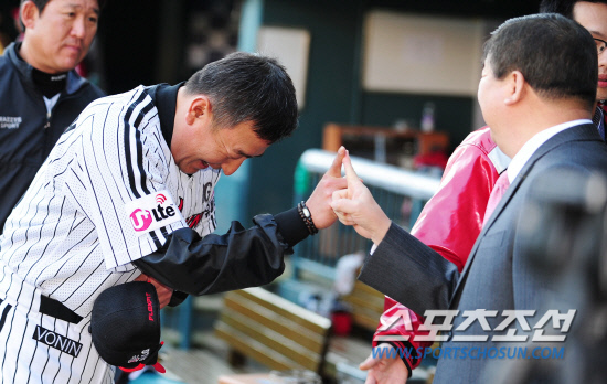 새로운 라이벌 LG와 넥센의 2012 프로야구 경기가 26일 잠실 야구장에서 열렸다. 경기에 앞서 817게임으로 투수 최다경기 출전 기록을 세운 류택현에 대한 KBO 구본능 총재의 시상이 있었다. 시상을 위해 잠실 구장을 찾은 구본능 KBO 총재가 LG 김기태 감독과 손가락 세리머니를 하고 있다. 잠실=조병관 기자 rainmaker@sportschosun.com/2012.04.26/