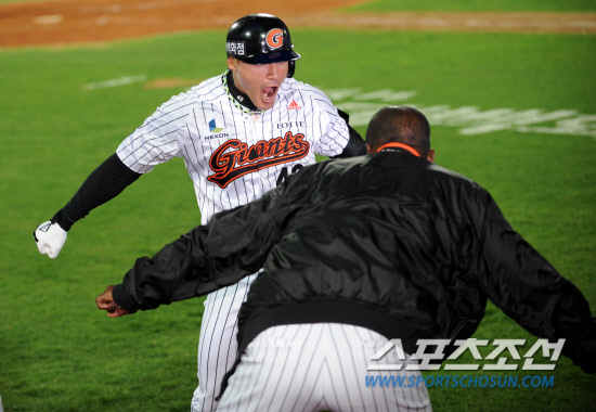 롯데와 SK의 주중 3연전 첫번째 경기가 17일 부산 사직구장에서 열렸다. 4회말 1사 1루 롯데 홍성흔이 우월 2점짜리 동점홈런을 치고 유먼과 세리머니를 하고 있다. 부산=허상욱 기자 wook@sportschosun.com/2012.04.17/