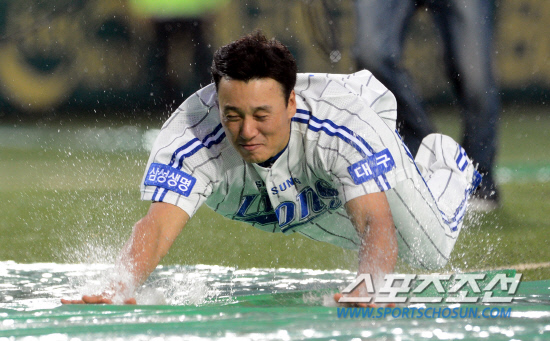 하지만 이승엽은 자기 몸 보다 팬을 최우선으로 생각했다. 1일 대구구장에는 삼성-두산전을 관전하기 위해 8800여명의 팬들이 찾았다. 비가 내려 경기는 취소됐다. 그냥 돌아가는 팬들의 아쉬움을 달래기 위해 삼성 선수들이 우천 세리머니를 했다. 그 과정에서 이승엽이 예정에도 없던 헤드퍼스트슬라이딩을 했다. 이승엽 같은 큰 스타가 이런 퍼포먼스를 하는 건 극히 드문 일이다.
