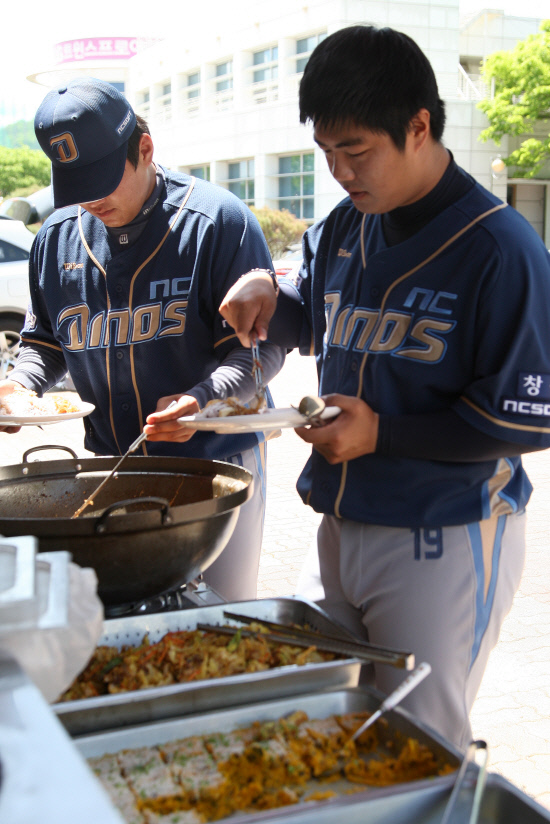 박 매니저는 "지금은 비록 퓨처스리그에 있지만, 우리팀은 언제나 1군 수준의 지원을 해야한다. 든든히 밥을 먹고 경기를 한다면 경기력에도 좋은 영향을 미칠 것"이라고 밝혔다. 선수들과 함께 밥차를 이용한 김경문 감독 역시 엄지를 치켜들었다. 김 감독은 "음식이 아주 잘 나온다. 선수들이 맛있게 먹는 모습을 보니 나도 흐뭇하다"며 웃었다.
