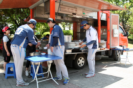 결국 보다 못한 박보현 매니저가 '밥차' 아이디어를 냈다. 두산과의 원정경기가 열린 지난 27일 이천구장에 처음 밥차가 등장했다. 밥차는 흔히 영화나 방송 촬영 현장에서 연기자 및 스태프들의 식사를 책임지는 이동 차량을 말한다. 푸짐한 밥과 함께 반찬 역시 케이터링서비스 못지 않게 좋다. 직접 현장에서 요리를 하기에 위생이나 영양에 있어서도 좋다. 운동량이 많은 선수들을 위해 '고기 반찬'은 언제나 듬뿍 준비돼 있다.