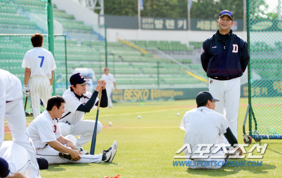 | 두산 김진욱 감독이 스트레칭을 하고 있는 김현수 앞에 서서 타격폼에 관해 이야기를 하고 있다. 대구=전준엽 기자 noodle@sportschosun.com |